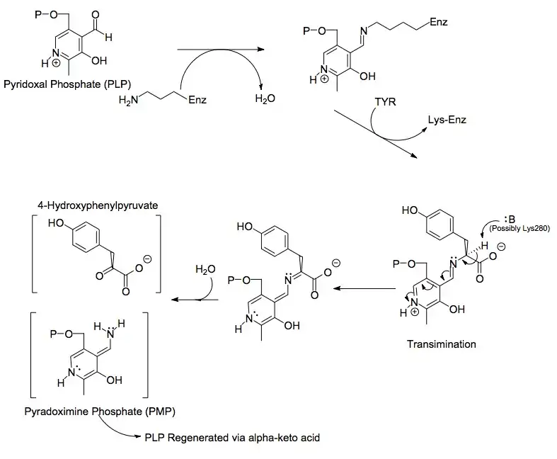 Each side of the dimer protein includes pyridoxal phosphate (PLP) bonded to the Lys280 residue of the tyrosine aminotransferase molecule. The amine group of tyrosine attacks the alpha carbon of the imine bonded to Lys280, forming a tetrahedral complex and then kicking off the LYS-ENZ. This process is known as transimination by the act of switching out the imine group bonded to PLP. The newly formed PLP-TYR molecule is then attacked by a base.