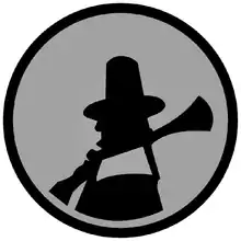 - Description: On a disc silver gray, edged with a .32 cm (1/8-inch) black border, depicting the black silhouette of a Puritan carrying a flintlock blunderbuss on his shoulder. (This insignia was derisively referred to by some as the "Puking Pilgrim".)
