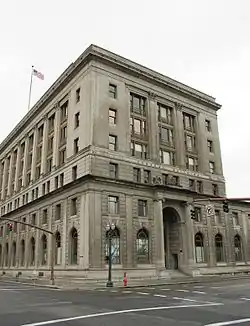 The building was constructed in 1916–1918 and opened in 1919[1] after being commissioned by the Secretary of the Treasury, one of the last post offices built under the 1893 Tarsney Act, and cost $1 million.[5] It was designed by architect Lewis P. Hobart.[1] It is located between Portland's Old Town Chinatown and the Pearl District. It was added to the National Register of Historic Places[5] in 1979, as the U.S. Post Office.[1][2] The building is six stories tall and has a footprint of approximately 20,000 square feet (1,900 m2).[6] It has a basement and sub-basement, complete with walled off shanghai tunnels.