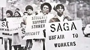 On November 7, around 250 workers resumed the strike, and in the following months, much more active forms of protest were used to garner a public response from SAGA. Student groups convened forums to address the issues from their perspectives, and speakers and civil rights leaders were invited to Chapel Hill to bring attention to the ongoing Strike. After nearly a month of striking, police arrested nine members of the Black Student Movement, some of whom helped coordinate the food workers' unionization, and charged them failure to disperse and disorderly conduct. Reverend Ralph Abernathy joined the protest on December 6 to show his solidarity with the workers and to pledge "his spiritual, moral and financial support if not [his] physical presence."[14] In this second round of protest, the public support of leaders and outspoken youth allowed for a quicker resolution when negotiations stalled. Mary Smith organized an event that she named "Black Monday", a day in which thousand of supporters of the food workers agreed to descend upon the campus to force an end to the stalemate.[15] The strike came to a final end on December 9, 1969, one day after the proposed "Black Monday", and although lesser contractual disputes continued to arise over the coming years, many of the employee demands were accepted and enacted in the following five years.[2]