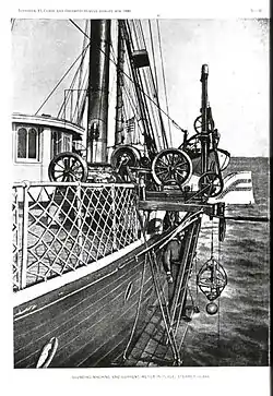 Among the notable discoveries linked to the ship was the definition of bathymetry proving an unexpected at the time and unusual feature of the United States continental slope, now named for the ship as the Blake Plateau. Initial findings of such a plateau were found in June 1880 during investigations of the Gulf Stream.[2] During her first survey season, starting in June 1874, George S. Blake was being used to test deep sea equipment designed by Sir William Thomson, the Thomson Sounding Machine (also known as the Kelvin sounding machine[3]), as modified by Commander Belknap, USN and to bring up specimens from 2,144 fathoms (12,864 ft; 3,921 m) in the Gulf of Maine. By the time the ship reached the Gulf of Mexico in 1875 under the command of Lieutenant Commander Charles Dwight Sigsbee, USN[Note 1] the ship was using a modification of the Thomson sounding machine designed by Sigsbee, known as the Sigsbee sounding machine that was the standard wire sounding device for fifty years,[5] and with the shot release device first tested the previous year with Sigsbee attached to the survey party.[6][7][8]