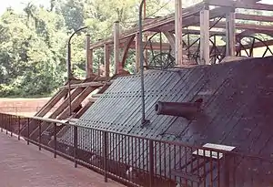 USS Cairo in her final resting place at Vicksburg National Military Park. A wooden framework has been built to support what remains of the ship.
