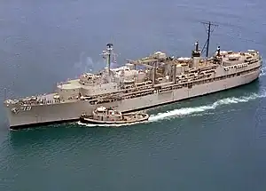 The exchange was completed by mid-January, 1973, and Proteus resumed her duties. In 1974 personnel from the Ship Repair Facility at Naval Base Guam removed the remaining 5-inch gun turret and munitions as unnecessary for her primary mission – leaving only the four 20mm mounts as her main defensive weapons. When Saigon fell in 1975, some 100,000 Vietnamese fled their country and were processed by the U.S. on Guam. In a massive undertaking called Operation New Life,[3] every able-bodied individual who could be spared helped provide facilities to care for the refugees. As part of that effort over 1,000 officers and men from Proteus worked with Seabee construction personnel to erect the refugee tent city at Orote Field on Naval Base Guam, leaving only a hand-picked skeleton crew of individuals aboard to see to her safety and security; as well as handle emergencies from the boats that were in. But for that week, Proteus was out of business as usual – for which the Secretary of the Navy awarded Proteus her second Meritorious Unit Commendation in 1975; and she (along with other participating Navy Units) were awarded the first award of the Navy Humanitarian Service Medal (established by Executive Order January 1977 for actions beginning 1 April 1975).