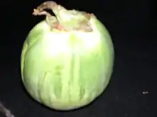 Mattu Gulla is green in colour, unlike the purple brinjals grown in other places. As the word "Gulla" indicates, it is spherical in shape.[3] It is a seasonal vegetable which is grown after the monsoon season from the months of September and October.[2][4] It has low moisture content and is known for its unique taste.[5] Mattu Gulla is a widely used vegetable in Udupi cuisine especially the sambar.[3][6] Mattu Gulla obtained the Geographical Indication tag in 2011 for its unusual and unique taste and exclusive location of production.[4]