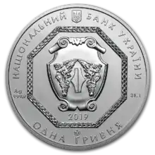 Obverse: The coat of arms of Ukraine and the inscription "НАЦІОНАЛЬНИЙ БАНК УКРАЇНИ" (National Bank of Ukraine) are at the top of the coin. Inside an octagonal cartouche at the centre is a shield with the emblem of the National Bank of Ukraine. At the bottom of the coin, it is inscribed in Ukrainian the value of the coin. On the one-ounce silver coin, it is inscribed with "ОДНА ГРИВНЯ" (one hryvnia).[1]