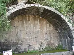 The Arabic word qantara, pl. qanatir, can mean arch,[6] a bridge built of stone or masonry, an aqueduct or a dam, and a high building.[7] The name of the site derives from its location 200 metres from a natural spring that flows from the cliff into three basins that were once topped by monumental basalt arches, one of which has survived.[1]
