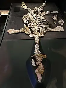 The holotype of Umoonasaurus demoscyllus is AM F99374, an opalized skeleton that has been nicknamed "Eric". It was discovered in the Zorba Extension Opal Field near the town of Coober Pedy, and is very well preserved, representing the most complete opalized fossil of a vertebrate known. Other specimens have also been referred to this species. SAM P2381, discovered in the Andamooka opal fields, is another opalized specimen. SAM 31050 was discovered in the Curdimurka area near Lake Eyre, and SAM P410550, a juvenile specimen, comes from the Neales River region, near the town of Oodnadatta.[1] Another juvenile specimen, SAM P15980, was later referred to this species. All known specimens come from the Bulldog Shale in South Australia, although material very similar to Umoonasaurus has been found in the Darwin Formation in the Northern Territory.[2]