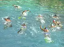 At a club or training level, underwater hockey is not seen as particularly spectator-friendly. Very few pools have underwater viewing ports, and since the action is all below the surface, an observer would usually have to enter the water to see the skill and complexities of the game. Spectators may either put on mask, fins and snorkel and enter the pool for a view of the playing area, or possibly take advantage of the work of underwater videographers who have recorded major tournaments.[22] Such tournaments often have live footage on large screens for the spectators. The 2006 (Sheffield, England) and 2010 (Durban, South Africa) Underwater Hockey World Championships were screened poolside and simultaneously webcast live to spectators around the world, while the 2008 European Championship in Istanbul, Turkey had excellent video coverage but no live streaming.[23]