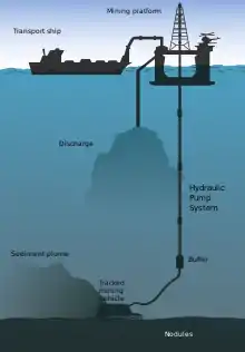 Seabed mining, also known as Seafloor mining[1] is the recovery of minerals from the seabed by techniques of underwater mining. The concept includes mining at shallow depths on the continental shelf and deep-sea mining at greater depths associated with tectonic activity, hydrothermal vents and the abyssal plains. The increased requirement for minerals and metals used in the technology sector has led to a renewed interest in the mining of seabed mineral resources, including massive polymetallic sulfide deposits around hydrothermal vents, cobalt-rich crusts on the sides of seamounts and fields of manganese nodules on the abyssal plains.[2] Whilst the seabed provides a high concentration of valuable minerals there is an unknown risk of ecological damage on marine species because of a lack of data.[1][2]
