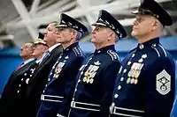 The Air Force Chief of Staff and the Chief Master Sergeant of the Air Force are authorized to wear a special ceremonial uniform consisting of a stand-collar coat and braided trousers similar to the ceremonial band uniform, with the addition of a silver braid trimmed belt. Each uniform costs $700 with the wearer required to personally pay for purchase.[18] This uniform was worn on 10 August 2012 at the ceremony in which Gen. Mark Welsh III succeeded Gen. Norton Schwartz as the 20th Air Force Chief of Staff,[19] but was not used for the subsequent ceremonies of Gen. David L. Goldfein and General Charles Q. Brown.[20][21]