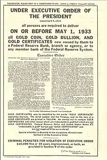 - ↑ Roosevelt, Franklin D. (April 5, 1933). "Executive Order 6102: Requiring Gold Coin, Gold Bullion and Gold Certificates to Be Delivered to the Government". Archived from the original on February 12, 2008. Retrieved April 23, 2006.