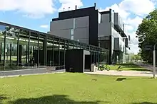 In response to the doubling of student enrolment over the past decade, the UTM campus building infrastructure has continued to expand to meet growing enrollment needs.[32][33] The construction of the Instructional Centre, also known as the Instructional Building (IB), had plans drawn out in 2002.[34] Located next to the Hazel McCallion Academic Learning Centre and Library on the north side at the end of the campus's outer circle road, the Instructional Building covers a total of 13,000 square metres (140,000 sq ft) of space spread out throughout its three stories. The much-innovated construction of the IB building is composed of green patinated copper strips aiming in a vertical direction continuing inside the building, adding to the physical appearance of the facility.[35] The use of the copper panels increases classroom space by 50% and increases the use of green infrastructure by 60%.[35][36] UTM's Instructional building includes geothermal heating and cooling systems under the nearby football field as well as awnings with thin photovoltaic cells which contribute to shade on the south side of the building.[35][36][37] Other renewable energy ideas were also included in the construction of the building such as the inclusion of green roofs and reflective membranes which play a big role in the reduction of urban heat as well as energy and water-efficient lighting and fixtures.[36][37] The building has been considered as a LEED silver-certified project and will soon be certified as LEED Gold. In addition, the building contains many windows, which enable much light to enter which creates a warm and friendly atmosphere for students.[32]