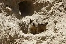 The ground squirrels hibernate in burrow chambers called hibernacula. Males tend to hibernate alone while females tend to hibernate together.[4] The time in which ground squirrel emerge from their hibernation also depends on different factors. At lower elevations, males emerge in February while at higher elevations, they emerge at the end of April.[4][6] Female emergence is spread over several weeks.[8]