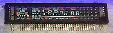 The light emitted by most VFDs contains many colors and can often be filtered to enhance the color saturation providing a deep green or deep blue, depending on the whims of the product's designers. Phosphors used in VFDs are different from those in cathode-ray displays since they must emit acceptable brightness with only around 50 volts of electron energy, compared to several thousand volts in a CRT.[12] The insulating layer in a VFD is normally black, however it can be removed or made transparent to allow the display to be transparent. AMVFD displays that incorporate a driver IC are available for applications that require high image brightness and an increased number of pixels. Phosphors of different colors can be stacked on top of each other for achieving gradations and various color combinations. Hybrid VFDs include both fixed display segments and a graphic VFD in the same unit. VFDs may have display segments, grids and related circuitry on their front and rear plass panels, using a central cathode for both panels, allowing for increased segment density. The segments can also be placed exclusively on the front instead of on the back, improving viewing angles and brightness.[13][14][15][16][17][18][19][20][21]