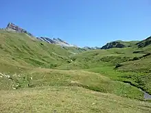 Path ascending into the Val Vignun, on the left the Piz Uccello
