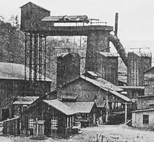 Nittany Furnace around the time of its purchase by the Nittany Iron Company, looking towards the northwest. The building on the left is the stock house, the furnace lies to the center of the photo, connected by a hoist to the stock house, and the three stoves for the hot blast are visible in front of the furnace.