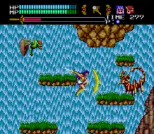The main difference between Valis III and previous games in the Valis series is that the player is now in control of multiple characters that can be switched at any time (reminiscent of Castlevania III: Dracula's Curse). Each character uses different upgradable weapons (Yuko has a chargeable energy wave, Cham has a whip, and Valna shoots magical blasts from her wand) and spells (of lightning, fire, and ice variety). The characters cannot be switched during boss fights, where the choice of the character also results in a different cutscene. Some stages also force the player to play as a particular character, usually the main heroine Yuko. Another feature new to the series is a ground slide move which can double as an attack.[3][4][5] The Sega Genesis port has most of the cinematic cutscenes removed. Several levels were removed as well, and a new one was added to this version, while the remaining levels are more similar to each other. However, boss fights and parallax scrolling were improved.[3]