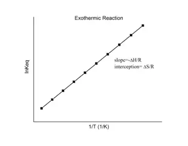 By measuring the equilibrium constant, Keq, at different temperatures, the Van 't Hoff plot can be used to assess a reaction when temperature changes.[7][8] Knowing the slope and intercept from the Van 't Hoff plot, the enthalpy and entropy of a reaction can be easily obtained using