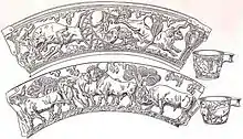 By far the finest of the grave goods are a pair of golden cups decorated with scenes in relief, showing two different methods of capturing bulls, perhaps for the bull-leaping activities practised by the Minoan civilization of Crete, or for sacrifice. On one, with three scenes, a cow is used to lure a bull; they mate, and a rear leg is then roped; this is sometimes called the "Peaceful Cup" or the "Quiet Cup". In the other, the "Violent Cup", bulls are stampeded into nets, although one seems to escape, shoving catchers aside.[7] The so-called "Violent Cup", showing netting of bulls, bears a remarkable resemblance to the description of the beginning of the ritual of consecration for the laws of Atlantis described in Plato's dialogue Critias, where bulls are captured for sacrifice, using no iron tools or weapons.[8]