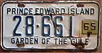 1964–65 | Embossed dark blue serial on white plate with border line; "PRINCE EDWARD ISLAND" at top; "64" at right | "GARDEN OF THE GULF" at bottom | 12-345 | 20-001 to approximately 51-000 | Revalidated for 1965 with yellow tabs. |