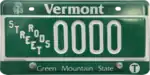 1977–84 Debossed white serial on green plate with border line; "VERMONT" centered at bottom; round sticker box at bottom left and rectangular sticker box at bottom right "GREEN MOUNTAINS" centered at top A·1234 A·100 to