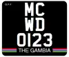 Rear Plate: 27x20 cm Black on yellow Bottom strip in Gambian Flag Text in the center bottom, saying The Gambia |