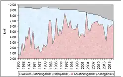 The diagrams on the right demonstrate the data collected by the Commission for Glaciology of the BAdW since 1965 on the growth of the Vernagtferner glacier. The upper diagram shows the glacier's area, with the ablation and accumulation areas (nutrient and supply areas) displayed in different colors. The lower graphic presents the overall mass evolution. The Equilibrium Line Altitude (ELA), which marks the altitude where the mass balance of the year is balanced, is also shown to be rising. This line divides the accumulating area and the ablation area.