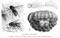 In V. crabro, the nest is founded in spring by a fertilized female known as the queen. She generally selects sheltered places such as dark, hollow tree trunks. She first builds a series of cells (up to 50) out of chewed tree bark. The cells are arranged in horizontal layers named combs, each cell being vertical and closed at the top. An egg is then laid in each cell. After 5–8 days, the egg hatches. Over the following two weeks, the larva progresses through five stages of development. During this time, the queen feeds it a protein-rich diet of insects. Then, the larva spins a silk cap over the cell's opening, and during the next two weeks, transforms into an adult, a process called metamorphosis. The adult then eats its way through the silk cap. This first generation of workers, invariably females, now gradually undertakes all the tasks formerly carried out by the queen (foraging, nest building, taking care of the brood, etc.) with the exception of egg-laying, which remains exclusive to the queen.