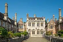 The Chain Gate, built with Doulting stone, was abutted to the hall in 1459 by Thomas Beckington. This included a gallery over the gate into the cathedral for the vicars' convenience.[20]