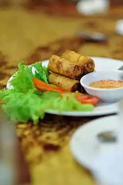 Chả giò (Vietnamese: [ca᷉ː jɔ̂]), or nem rán, also known as fried spring roll, is a popular dish in Vietnamese cuisine and usually served as an appetizer in Europe, North America & Australia, where there are large Vietnamese diaspora. It is ground meat, usually pork, wrapped in rice paper and deep-fried.[1][2]