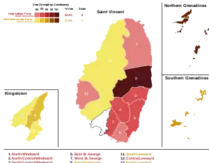 A total of 43 candidates contested the elections.[3] The two biggest parties were the incumbent Unity Labor Party of Prime Minister Ralph Gonsalves and the opposition New Democratic Party of Arnhim Eustace, both of which ran candidates in all the 15 constituencies. Smaller parties included the Green Party and the Democratic Republican Party, who only competed in seven and six constituencies respectively.[4]