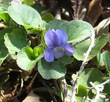 Viola walteri, the prostrate blue violet,[1] is a perennial plant in the violet family (Violaceae). It is native to Southeastern and Appalachian North America. It is generally uncommon throughout its range, with populations becoming fragmented in the north. Viola walteri is found in rich calcareous forests and woodlands, often in dry rocky areas. It is a spring ephemeral, flowering March through May. It distinguished by its creeping, rooting stolons, which is thought to be indicative of it being transitional between the caulescent and acaulescent violets.