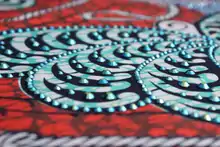 Unlike the Vlisco brand, the entire process – from design to production and distribution – for the Woodin, Uniwax and GTP brands takes place in Africa. When, in the mid-1960s, the import duties on printed textiles were doubled in several Western African countries, a percentage of imports were replaced by local production. This led to the establishment of the GTP (Ghana Textiles Printing Company) brand in 1966, with production taking place at a factory in Ghana, and the establishment of Uniwax in 1970, with production facilities in the Ivory Coast (Koert van, Robin, Dutch Wax Design Technology: van Helmond naar West-Afrika, 2008). The pan-African brand Woodin has been produced in both the GTP and Uniwax factories since 1985. Furthermore, Vlisco made a historical decision in 1993 by abandoning hand printing, to be able to produce fabric on a larger scale.[3]