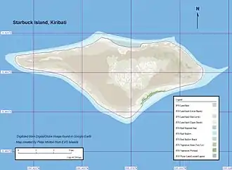 Located at 5°38′30″S 155°52′40″W / 5.64167°S 155.87778°W, just east from the geographic center of the Pacific Ocean (4°58′S 158°45′W / 4.97°S 158.75°W),[1] and measuring 8.9 kilometres (5.5 miles) east-to-west and 3.5 kilometres (2.2 miles) north-to-south, Starbuck Island has a land area of 1,620 hectares (4,003 acres).[2] It is a low, dry, coral limestone island with a steep beach backed by a 6–8-metre-high (20–26 ft) bank composed of large coral fragments. Several hypersaline lagoons form on the island's eastern side. These occasionally dry up, and are said to be dangerous to approach: one worker during the island's guano-mining days sank up to his neck in salty mud before being rescued.[3]