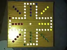 With 4 or 6 players: When 4 or 6 people are playing, there are two methods of play. One is partners. When playing partners, players opposite each other are partners. You are not allowed to "take out" your partner by landing on his marble, and you cannot pass your partner! When one partner gets all his marbles "home," he then uses his turn(s) to help his partner get his marbles home. The partners assist each other ONLY when one partner is finished. The first pair to get all their marbles "home" wins (regular rules apply). The other method is every man for himself, or "cut-throat." When playing cut-throat, there are no partners.
