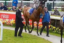 War Front is a bay horse bred by Joseph Allen and was foaled on February 11, 2002 at Claiborne Farm in Paris, Kentucky.[1][2] He was sired by Danzig, who won three minor races, but was then retired to stud undefeated as a result of knee problems. He went on to become a successful stallion and was champion sire of North America in 1991, 1992 and 1993. Amongst his other progeny are Chief's Crown, Dance Smartly, Danehill, Dayjur, Green Desert, Hard Spun and Lure.[3] War Front's dam is Starry Dreamer, a daughter of Rubiano who won six races and was placed in a number of graded races.[4] War Front was trained by H. Allen Jerkens.[5] At maturity he reached 15.3 hands (63 inches, 160 cm) high.[6]
