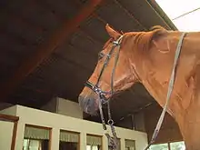 Some rope halters, usually made of yacht rope, are designed to be used for riding horses by the addition of various design elements, such as knots on the top of the nose, rings for reins so that it acts like a sidepull,[23] or a heavy bottom knot akin to that of a bosal.[24] Control is achieved by direct pressure on the nose. There is minimal, if any leverage, nor does a halter utilize any type of clamping action.