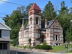 The library is set on the north side of Main Street (Massachusetts Routes 19 and 67), just east of the town's central business district and west of the town common. It is a 2-1/2 story structure, built of granite with brownstone trim, with a slate roof and a granite foundation. Its front facade is asymmetrically arranged into three sections, with a three-story pyramidally-roofed tower on the left, the main entrance in the center, and a large projecting gable section on the right. Courses of granite are periodically interspersed with bands of brownstone that extend across and around the building. The tower has a projecting bay window, above which is a round-arch opening with a pair of round-arch windows within, topped by an oculus. An arcade of small arched openings bands across the tower between that opening and the roof.[2]
