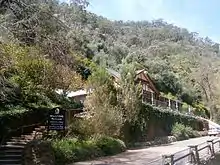 The completion of the road led to an increase in visitor numbers.[26] Rather than a bumpy horse ride,[28] visitors could now catch the horse tram to the start of the gully, and walk, cycle or ride to the falls.[29] To provide for tourists, the area gained a number of road-side kiosks and produce stalls, and the Mügge family erected the two-storey Waterfall Hotel along the path. Furthermore, in 1912 the government opened a kiosk at the base of First Falls,[26] designed in the "style of a Swiss chalet".[30] The hotel is a private residence today, but the kiosk continues to operate.[26]