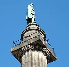 After the Duke's death in 1852, in common with other cities, Liverpool decided to erect a monument to celebrate his achievements. A committee was established to organise public subscriptions, but the money was slow to come in.[2] A competition was set up in 1856 to find a designer for the column, and this was won by the architect Andrew Lawson of Edinburgh. There were further delays while a suitable site was found, with sites at the top of Duke Street and Bold Street, in front of the Adelphi Hotel and Prince's Park being considered before the eventual location was settled on.[3] In 1861 a second competition, this time for the statue of the Duke, was won by George Anderson Lawson, brother of the column's designer.[4] The design of the column and plinth closely resembles that of the Melville Monument commemorating Henry Dundas, Lord Melville in St Andrew Square, Edinburgh,[5] itself loosely modelled on Trajan's Column in Rome.