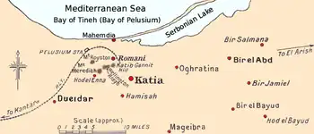 While at Kantara leave was granted for all ranks in Port Said and Sidi Bishr during September. On 10 October, once more part of the New Zealand brigade, the regiment moved forward to Maler, and reached Geeila, twenty-five miles (40 km) further east, on 24 October. The next phase of the campaign was an advance of fifty miles (80 km) across the desert to El Arish. The regiment continued moving east, reaching Moseifig on 27 October, and a troop from the 9th Squadron located a good water supply at Gererat only fifteen miles (24 km) from El Arish. On 11 November, the regiment advanced another fourteen miles (23 km) east to Mustagidda, establishing outposts at Arnussi and Zoabitia.[77] Overnight 15/16 November the post at Arnussi was attacked by Turkish camel troops, which withdrew before dawn.[78] The Allied attack on El Arish began on 20 December, the New Zealand and 3rd Light Horse Brigades being chosen to carry out the final assault from the south, while the rest of the division cut off any retreat. By dawn the brigade was in sight of its objective, and the town was surrounded. They then discovered that the Turkish forces, aware of the advance, had evacuated the town three days earlier.[79]