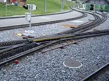 Diamond crossing at Grindelwald Grund. The Strub rack is shown clearly, with a short Riggenbach section across the crossing.