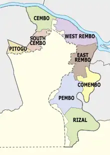 The Embo barangays are constituted as subdivisions of the city of Taguig.[9][31] These barangays, however, remain part of Makati's 2nd congressional district.[32] Barangays Post Proper Northside, Post Proper Southside, Pitogo, and Rizal are also grouped with other barangays with "Embo" in its name.