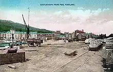 Much of the actual quarrying took place at high points on the Island, and getting the heavy material down to a quayside was a considerable task. In the early 1820s, this led to a tramway being promoted by interested parties, and the Portland Railway was incorporated by an Act of Parliament of 10 June 1825.[1][2] It was also known informally as the Merchants' Railway or the Freeman's Incline.[3] It consisted of a horse-drawn tramway from what is now Priory Corner and a counterbalanced incline 586 yards (536m) in length descending to sea level near Portland Castle. From there, a further horse-worked section led to Castletown Pier.[note 1] It had a track gauge of 4ft 6in (1,372mm), and it opened in October 1826.[3][4]