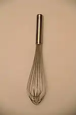 A whisk is a cooking utensil which can be used to blend ingredients smooth or to incorporate air into a mixture, in a process known as whisking or whipping. Most whisks consist of a long, narrow handle with a series of wire loops joined at the end. The loops can have different shapes depending on a whisk's intended functions. The wires are usually metal, but some are plastic for use with nonstick cookware. Whisks are also made from bamboo.