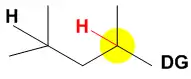 In the case where a bulky group, denoted at the right by BG, is present near multiple aliphatic C-H groups that are electronically equivalent, the bulky White–Chen catalyst will target the less sterically hindered C-H bond. In the case at the right there is a large bulky group in close proximity to one of two aliphatic C-H bonds. The C-H bond shaded in yellow is further from the bulky group, is less sterically hindered, and will therefore be the site of oxidation by the catalyst in this case. The bulky nature of the White–Chen catalyst allows product predictability based on steric properties of the starting materials given that electronic properties are equivalent.