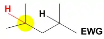In the case where an electron withdrawing group (EWG) is present in the substrate the highly electrophilic catalyst will oxidize the more electron-rich C–H bond that is most remote from the EWG. In the case above the C–H bond shaded yellow is further from the electron withdrawing group and therefore has a higher electron density than the one not shaded yellow. The yellow shaded C–H bond is therefore the primary site for oxidation by the catalyst.