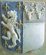 One of several escutcheons on monument of William Pole (d.1587), Colyton Church: left: Arms of Pole impaling Popham: Baron: azure seme of Fleurs-de-lys or a lion rampant argent (Pole) impaling femme: Argent, on a chief gules two buck's heads cabossed or (Popham); right: recreated arms of Popham