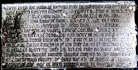 "Heer lieth the body of Katherin daughter of Alexander Popham of Huntworthi in the counti of Somerset Esquir., the sister of Sir John Popham, knight, Lo. Chief Justice of England, lately the wief of William Pole Esquier the Elder unto whom shee brought foorth William Pole, knight, and Dorothe the wife first of Thomas Erle Esquier, secondly of Walter Vaughan, knight, which were liveing and Alexander, Hugh, Richard, Arthur and Amy which died younge. She died the 28 of October 1588 unto the memori of whome Sr. Wm. Pole Knig. her son hath set this monument".