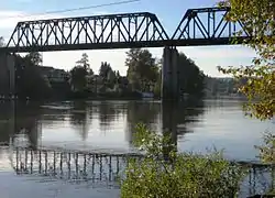 The first bridge was built in 1907 for the Oregon Electric Railway line that ran from Eugene to Portland.[1] That bridge was a steel, 2,430-foot (740 m) long structure slightly downriver from the Boones Ferry crossing at a section of the Willamette that runs east-west between Canby and Newberg.[1] Known as the Oregon Electric Wilsonville Bridge, the bridge had a southern approach consisting of a wooden trestle measuring more than 2,600 feet (790 m) in length.[2] This trestle caught fire in July 1939.[3]